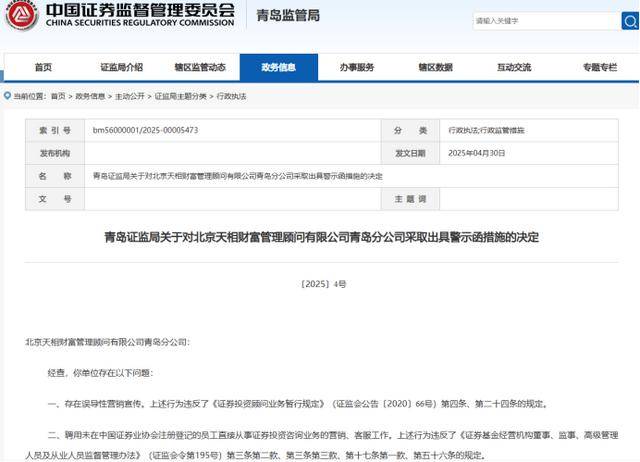 上述警示函显示,经查,北京天相财富管理顾问有限公司青岛分公司存在误导性营销宣传和聘用未在中国证券业协会注册登记的员工直接从事证券投资咨询业务的营销、客服工作的问题。依照《证券投资顾问业务暂行规定》(证监会公告〔2020〕66号)第三十二条、《证券基金经营机构董事、监事、高级管理人员及从业人员监督管理办法》(证监会令第195号)第五十一条第一款的规定,青岛证监局对其采取出具警示函措施,并将相关情况记入证券期货市场诚信档案,并要求其应当高度重视,认真整改,切实提高合规管理水平,规范展业行为。