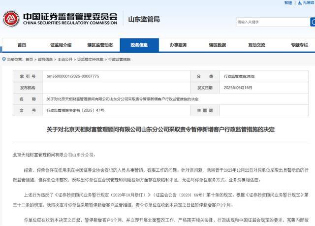 天相财富山东分公司则曾于2025年4月和2024年1月两度因违法违规被山东证监局处罚。其中前者被出具采取责令暂停新增客户行政监管措施的决定。上述行政监管措施显示,北京天相财富管理顾问有限公司山东分公司曾因存在任用未在中国证券业协会登记的人员从事营销、客服工作的问题,于2023年12月22日采取出具警示函的行政监管措施。但其却并未整改,反映出其在合规管理和风险控制方面存在缺陷和不足,无法与服务方式、业务规模相适应。为此,山东证监局决定对其采取暂停新增客户监管措施,责令其在收到本决定之日起暂停新增客户3个月,并要求其立即开展全面整改工作,严格落实相关法律、行政法规和中国证监会规定的要求,完善内部控制,切实提高合规管理水平。