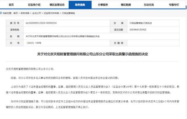 在此之前,2024年1月,证监会山东监管局官网公示的行政监管措施显示,经查北京天相财富管理顾问有限公司山东分公司存在多名从事证券投资顾问业务的营销、客服人员未在中国证券业协会登记的问题,因上述行为违反了《证券基金经营机构董事、监事、高级管理人员及从业人员监督管理办法》(证监会令第195号)第十七条第一款和第五十六条的规定。根据《证券基金经营机构董事、监事、高级管理人员及从业人员监督管理办法》第五十一条的规定,山东证监局对其采取出具警示函的行政监管措施。