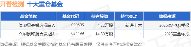 根据2026基金Q1季报公募基金重仓股数据,重仓该股的公募基金共1家,其中持有数量最多的公募基金为信达澳亚基金的信澳星亮智选混合A。信澳星亮智选混合A目前规模为0.19亿元,最新净值2.0363(4月20日),较上一交易日上涨0.84%,近一年上涨51.25%。该公募基金现任基金经理为冯玺祥。冯玺祥在任的基金产品包括:信澳量化多因子混合(LOF)C,管理时间为2023年3月15日至今,期间收益率为47.02%;信澳星耀智选混合A,管理时间为2023年8月22日至今,期间收益率为67.88%;信澳双创智选混合A,管理时间为2023年10月16日至今,期间收益率为117.06%;