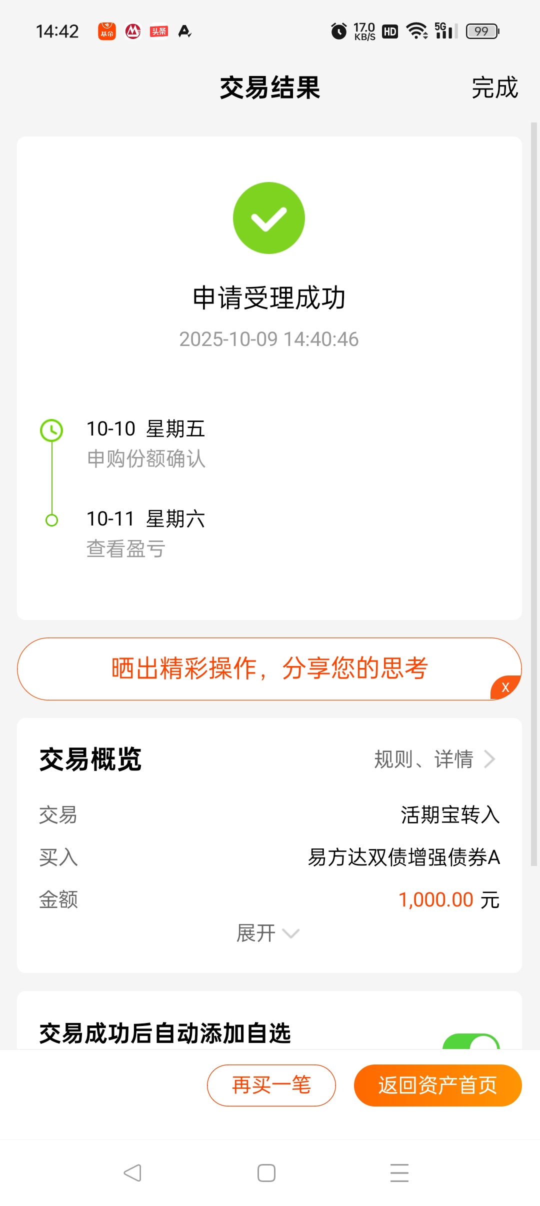 猴哥(小猴论市)个人午后买入1000块债券(110035)主题性基金符合后续加仓交易机会。(目前适合继续低吸潜伏,耐心等待)。此分享纯属义务劳动,不对任何人负责。买卖自由,对自己要负责! 朋友帮猴哥点点赞或者留言666表示支持!