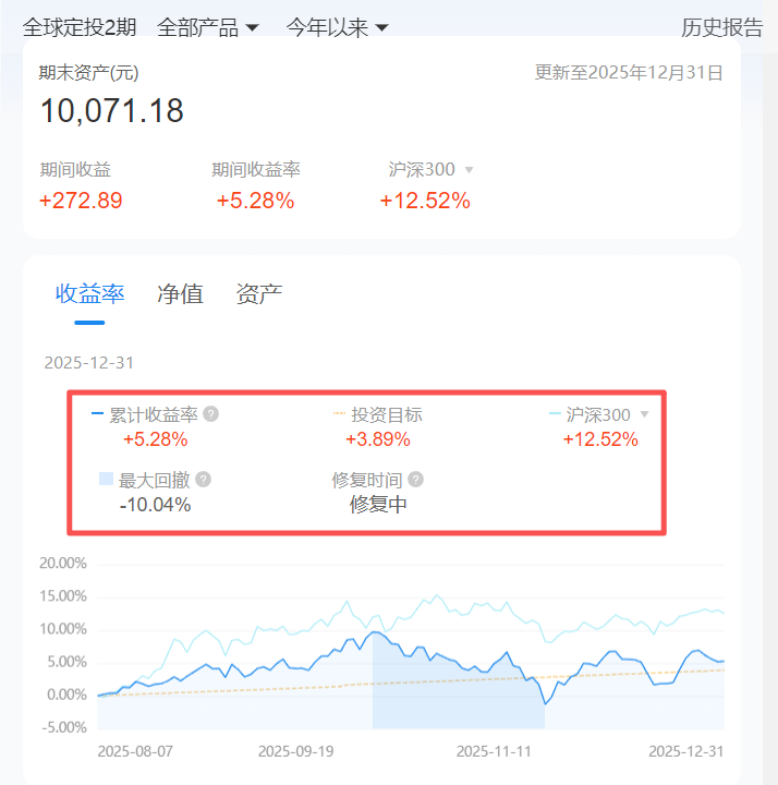 自25年8月7日实盘定投以来,截至2025年12月31日,最大回撤-10.04%,累计收益率+5.28%,同期沪深300指数收益率+12.52%。