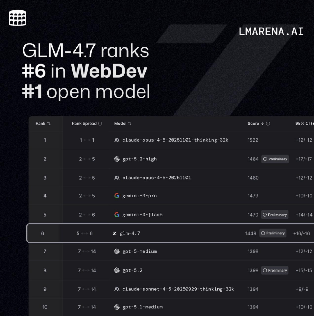 在全球百万用户参与盲测的权威编码评估系统Code Arena中,GLM-4.7位列全球开源第一、国产第一,超过GPT-5.2。