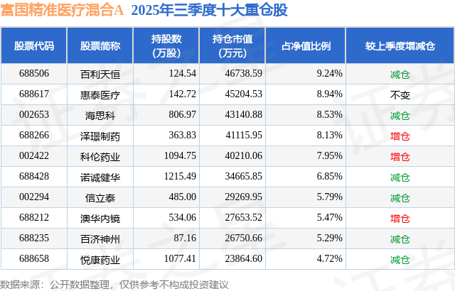 根据2025基金Q3季报公募基金重仓股数据,重仓该股的公募基金共21家,其中持有数量最多的公募基金为富国基金的富国精准医疗混合A。富国精准医疗混合A目前规模为34.91亿元,最新净值3.2598(1月8日),较上一交易日下跌0.01%,近一年上涨53.84%。该公募基金现任基金经理为赵伟。赵伟在任的基金产品包括:富国核心趋势混合A,管理时间为2023年5月16日至今,期间收益率为59.74%;富国医药创新股票A,管理时间为2024年3月12日至今,期间收益率为84.51%;富国科创板两年定开混合,管理时间为2024年4月23日至今,期间收益率为89.03%。