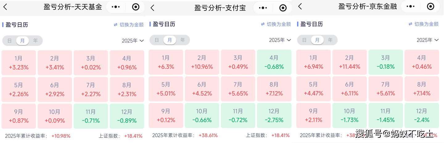 目前主要在三个平台上交易(在多平台写文章的原因),支付宝与京东金融上都是权益类基金,天天上权益类基金与纯债基金持仓各占50%左右,2025年的基金收益情况如图
