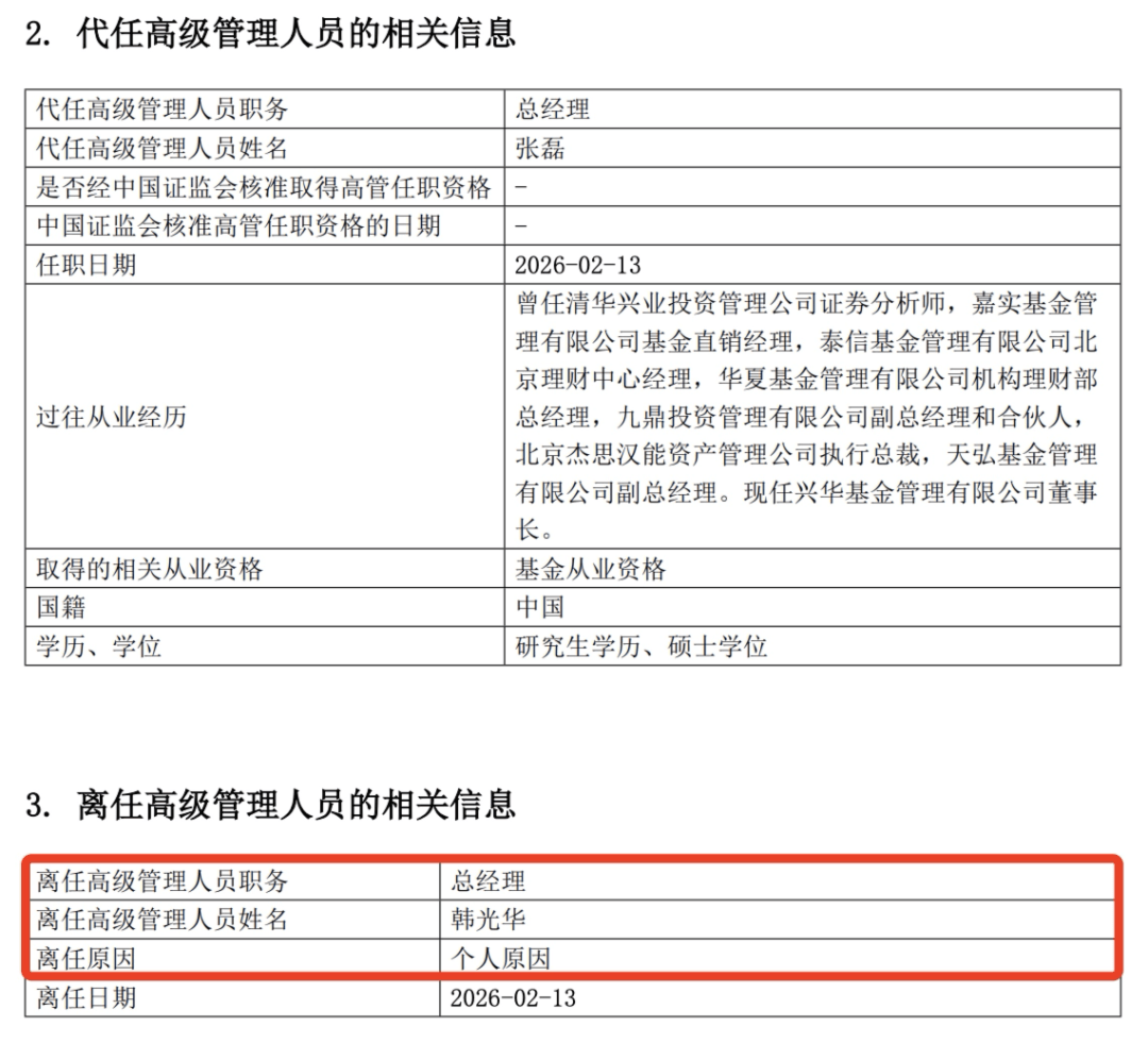 2月14日,兴华基金发布高级管理人员变更公告,总经理韩光华因个人原因离职,目前由董事长张磊暂时代任总经理职务。兴华基金同时称,对韩光华先生任总经理期间为公司发展所做出的贡献表示衷心的感谢。