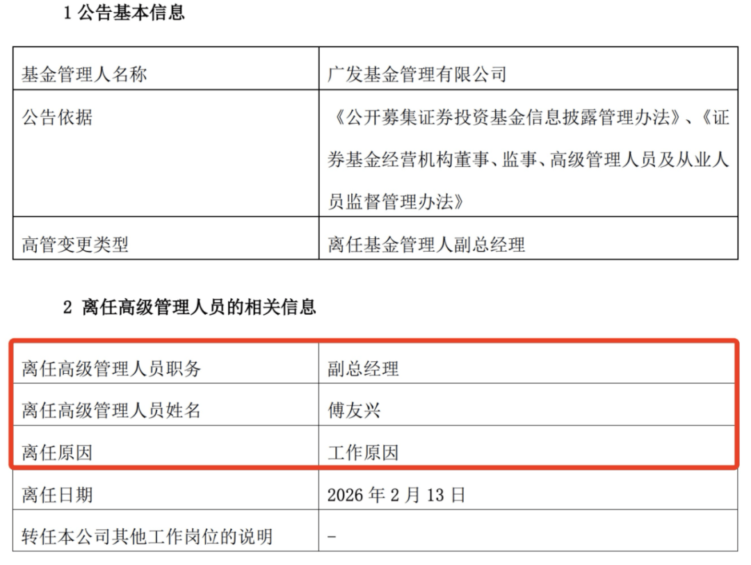 2月14日,广发基金公告称,傅友兴因工作原因离任副总经理。公开资料显示,傅友兴曾在原天同基金管理有限公司工作,2006年,他加入广发基金,历任广发基金研究员、机构理财部副总经理、规划发展部总经理、研究发展部总经理、权益投资一部副总经理。之后升任高级董事总经理、联席投资总监、价值投资部总经理。2021年9月17日,晋升公司副总经理。