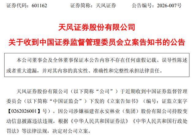 2月13日晚间,天风证券还公告称,公司于近期收到中国证监会下发的《立案告知书》,因公司涉嫌福建省永安林业(集团)股份有限公司持股变动信息披露违法违规,根据相关法律法规,决定对公司立案。目前公司经营情况正常。在立案调查期间,公司将积极配合中国证监会的相关调查工作,并严格按照有关法律法规及监管要求履行信息披露义务。