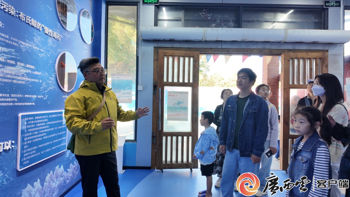 在南湾海洋运动公园科普打卡集市,志愿者给游客生动讲述布氏鲸如何“干饭”。记者 宾士雄 摄