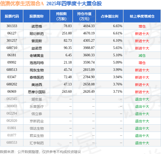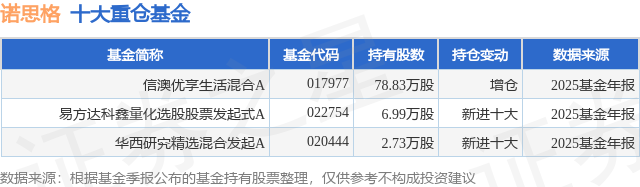 根据2025基金年报公募基金重仓股数据,重仓该股的公募基金共3家,其中持有数量最多的公募基金为信达澳亚基金的信澳优享生活混合A。信澳优享生活混合A目前规模为1.67亿元,最新净值1.1098(4月2日),较上一交易日下跌1.61%,近一年上涨16.61%。该公募基金现任基金经理为杨珂。