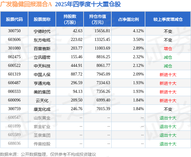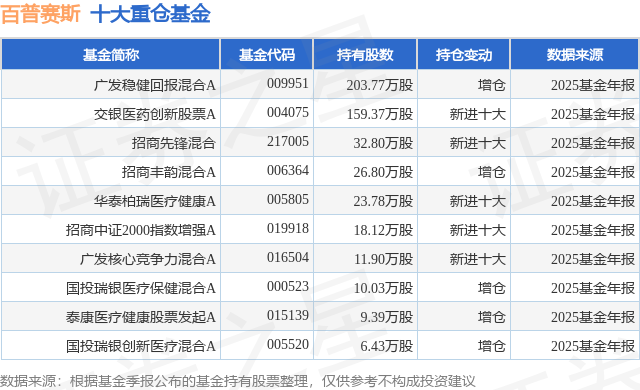 根据2025基金年报公募基金重仓股数据,重仓该股的公募基金共17家,其中持有数量最多的公募基金为广发基金的广发稳健回报混合A。广发稳健回报混合A目前规模为33.27亿元,最新净值0.8992(4月2日),较上一交易日下跌0.51%,近一年上涨10.79%。该公募基金现任基金经理为观富钦 王瑞冬。观富钦在任的基金产品包括:广发睿盛混合A,管理时间为2022年11月4日至今,期间收益率为34.79%;广发沪港深精选混合A,管理时间为2025年3月6日至今,期间收益率为10.38%;广发乾享核心精选混合A,管理时间为2025年9月25日至今,期间收益率为0.38%。王瑞冬在任的基金产品包括:广发均衡价值混合A,管理时间为2020年5月20日至今,期间收益率为72.96%;广发核心竞争力混合A,管理时间为2023年5月5日至今,期间收益率为30.92%;广发医药精选股票A,管理时间为2023年7月6日至今,期间收益率为18.47%。