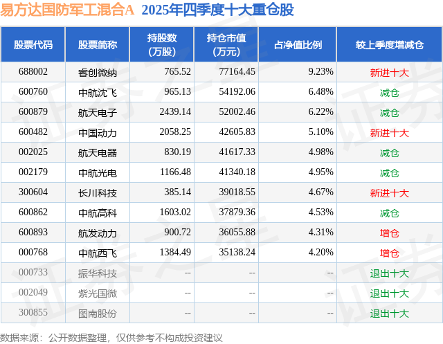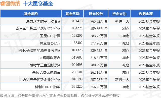 根据2025基金年报公募基金重仓股数据,重仓该股的公募基金共202家,其中持有数量最多的公募基金为易方达基金的易方达国防军工混合A。易方达国防军工混合A目前规模为72.81亿元,最新净值1.798(4月7日),较上一交易日下跌0.72%,近一年上涨42.13%。该公募基金现任基金经理为何崇恺。何崇恺在任的基金产品包括:易方达积极成长混合,管理时间为2021年5月29日至今,期间收益率为49.73%;易方达竞争优势企业混合A,管理时间为2025年6月21日至今,期间收益率为24.7%;易方达成长景明混合A,管理时间为2026年3月31日至今,期间收益率为nan%。
