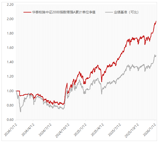 业绩基准为中证2000指数收益率*95%+人民币活期存款利率(税后)*5%。净值数据来源:华泰柏瑞,经托管行复核,业绩基准数据来源Wind,数据区间均为2024/1/12-2026/1/19,基金过往业绩不预示未来表现,基金管理人管理的其他基金的业绩并不构成本基金业绩表现的保证。